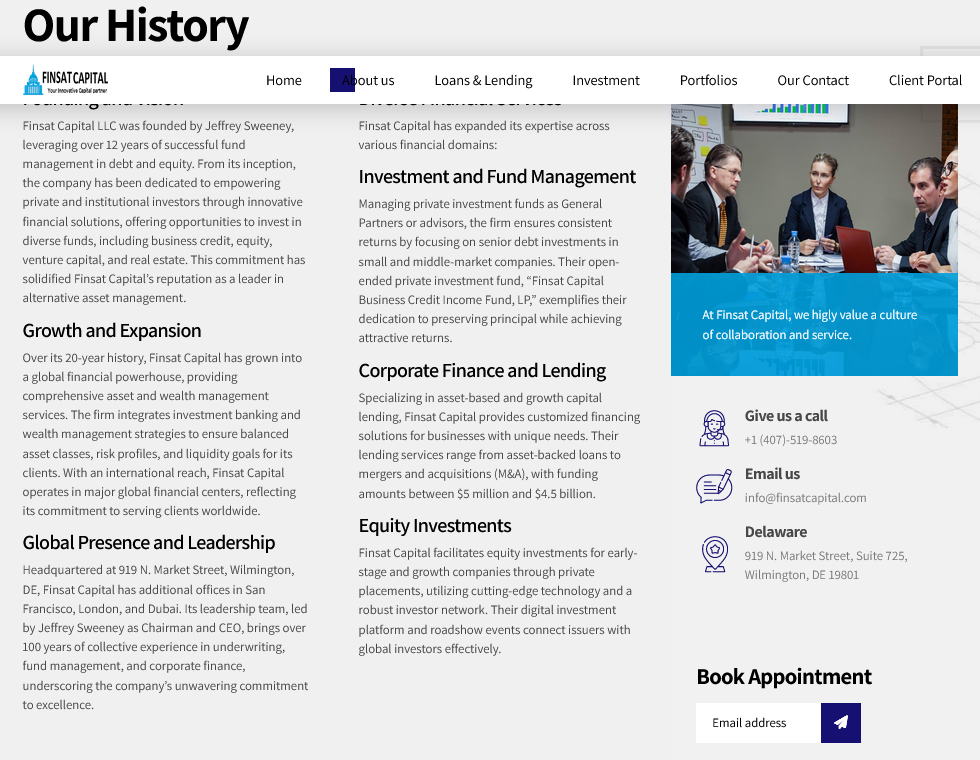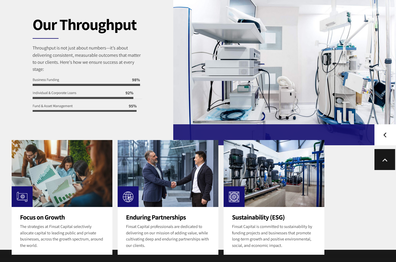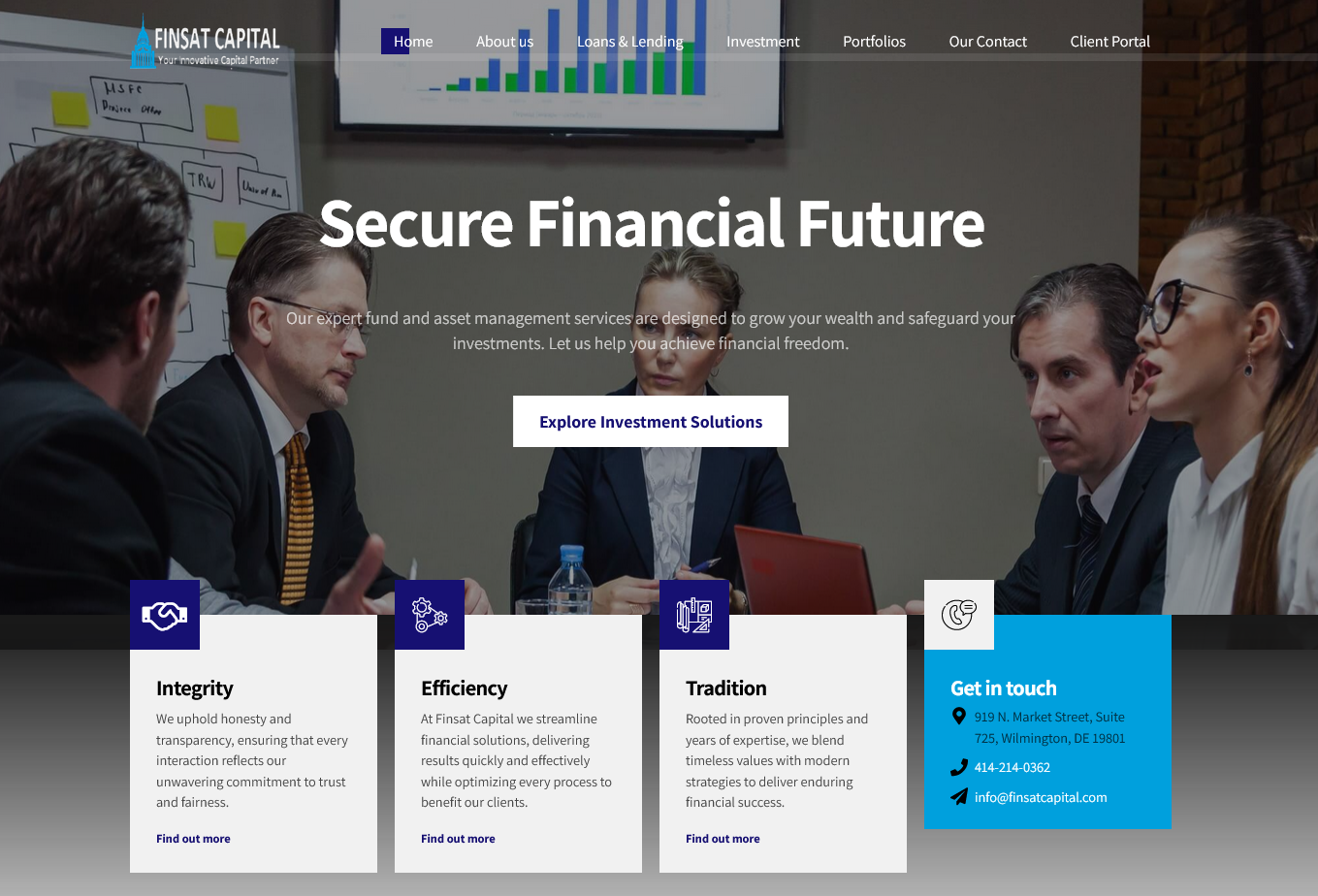 Direkt im sichtbaren Bereich: klare Value Proposition, animierte KPIs (z. B. verwaltetes Vermögen, Kundenzufriedenheit), Trust-Elemente (z. B. SEC-Konformität), sowie Testimonials im Slider-Format.